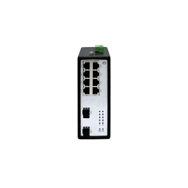 10-Port Layer 2 Industrial Switch made from aluminum alloy, support 2 100/1000BaseX SFP ports (SFP module not included) + 8 10/100/1000BaseT ports, DIN-Rail mounted. IP40 Protection Class. Operating temperature -40°C ~ +75°C. Dual 9.6 ~ 60VDC & 18 ~ 30VAC redundant power inputs.